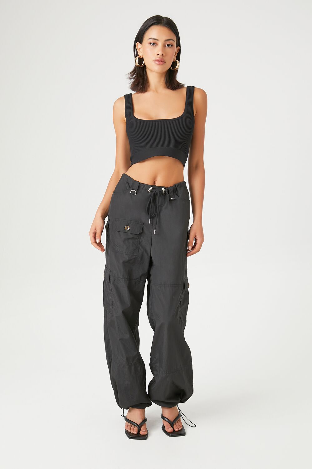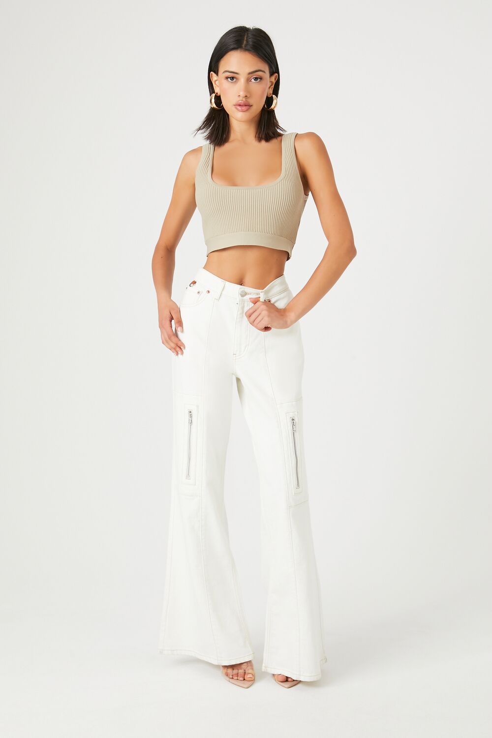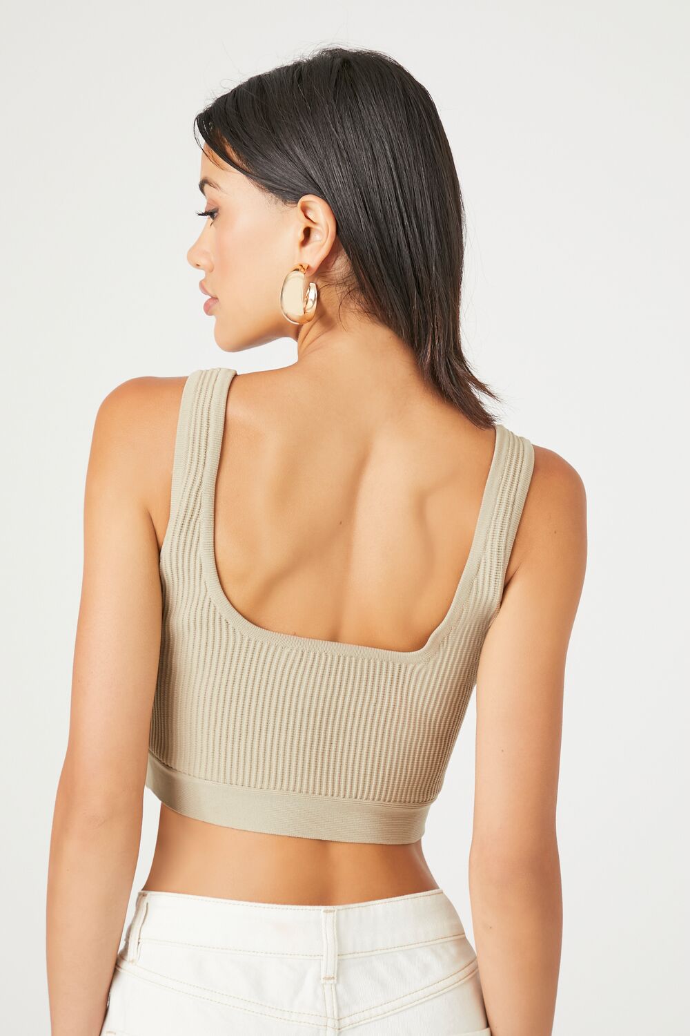 A sweater-knit tank top featuring a square-cut neckline and back, shoulder straps, ribbed construction, and cropped hem.Content + Care
