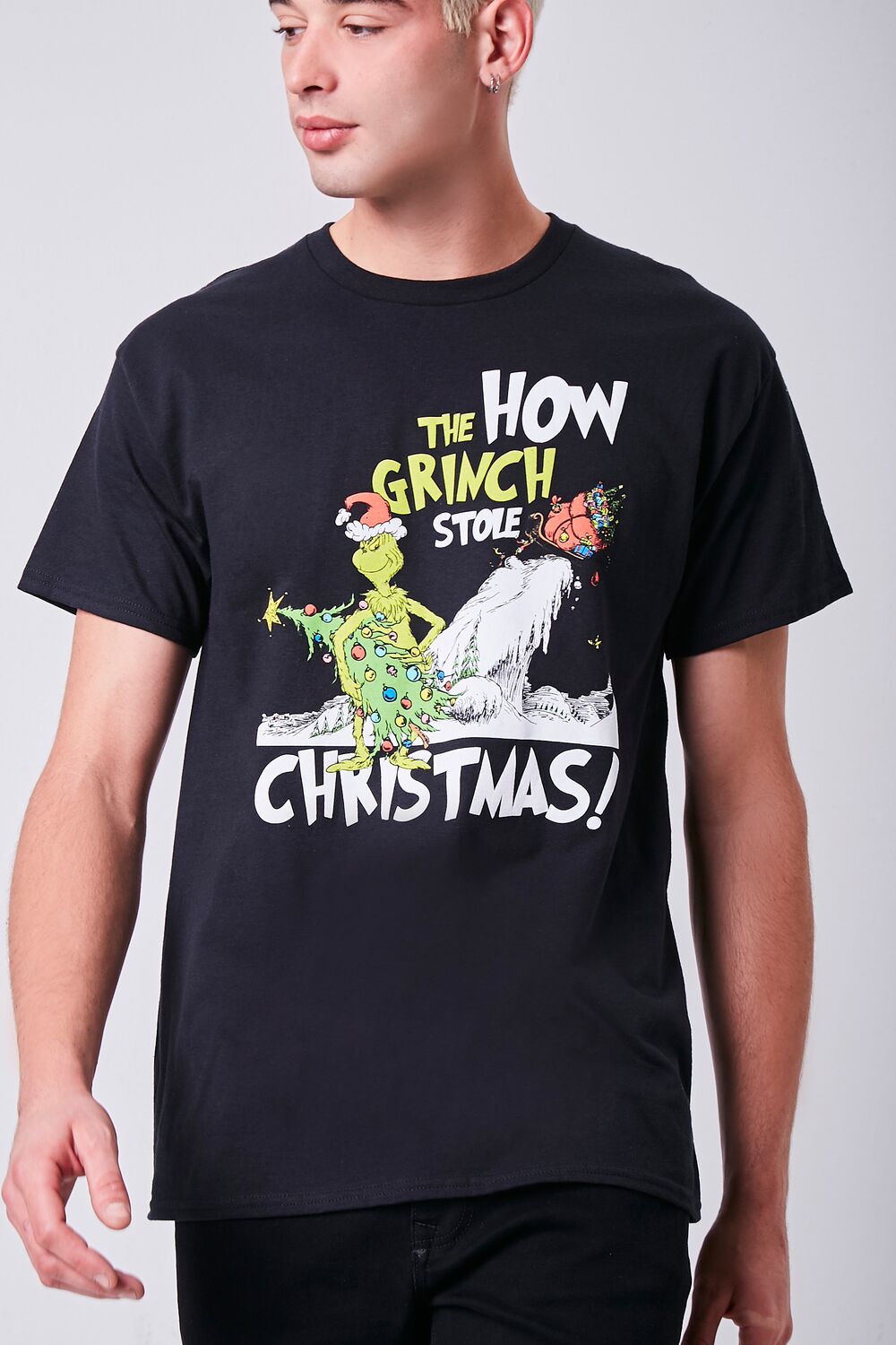 A knit tee featuring front ‘How The Grinch Stole Christmas!’ text with character and Whoville graphics, dropped short sleeves, and a crew neck.