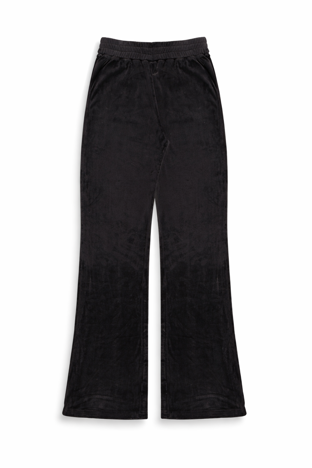 Mid-rise pants feature an elastic waistband and slight flare leg