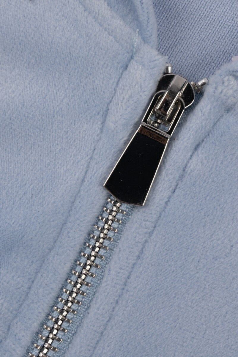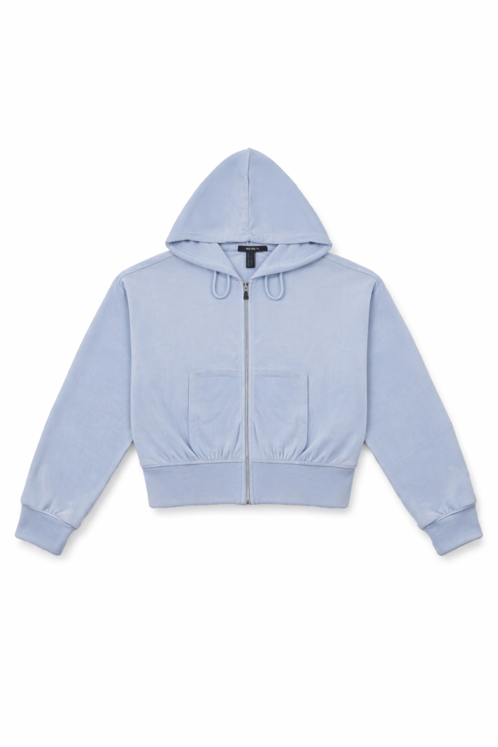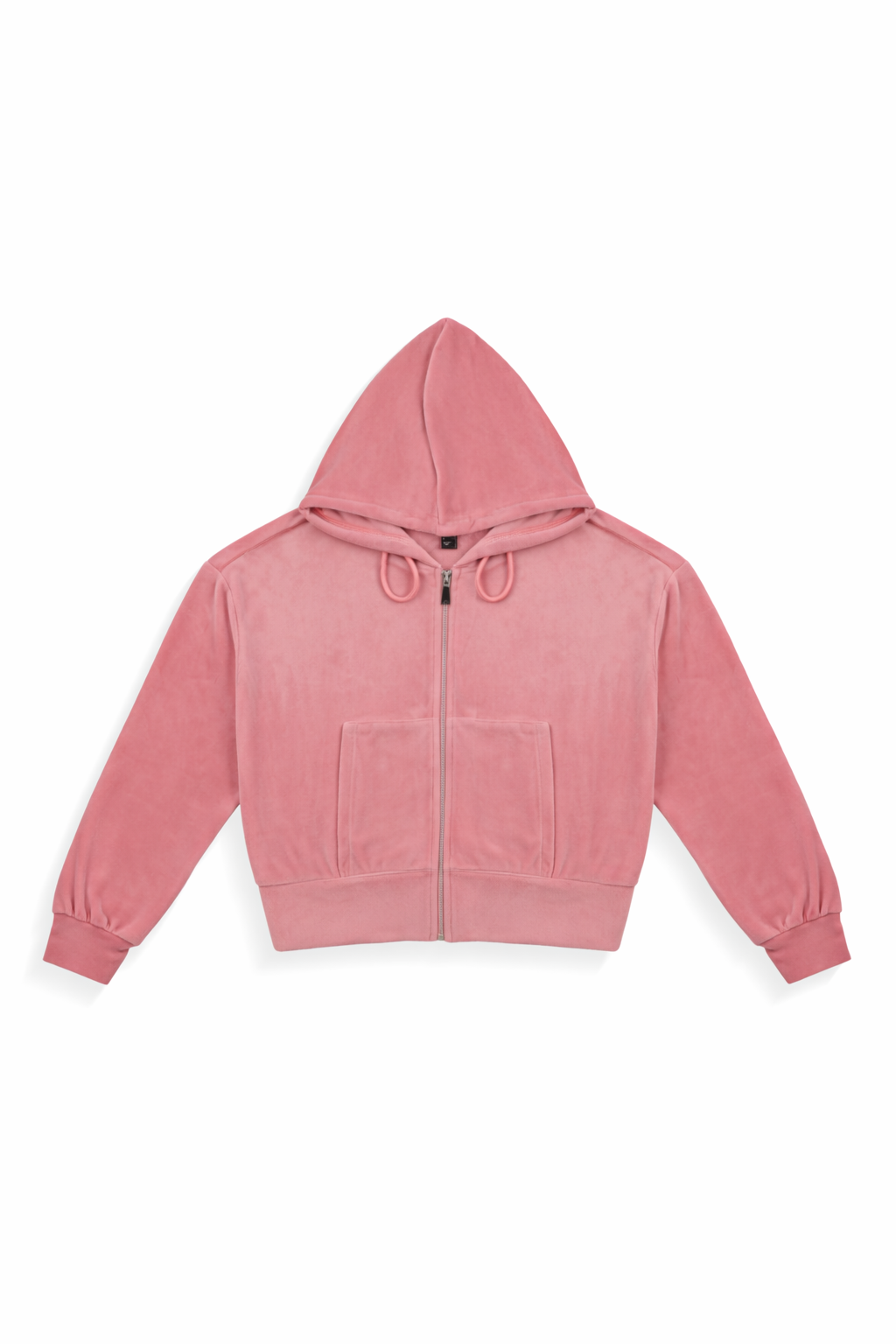 Soft velour two-piece set featuring a zip-front cropped hoodie and matching pants